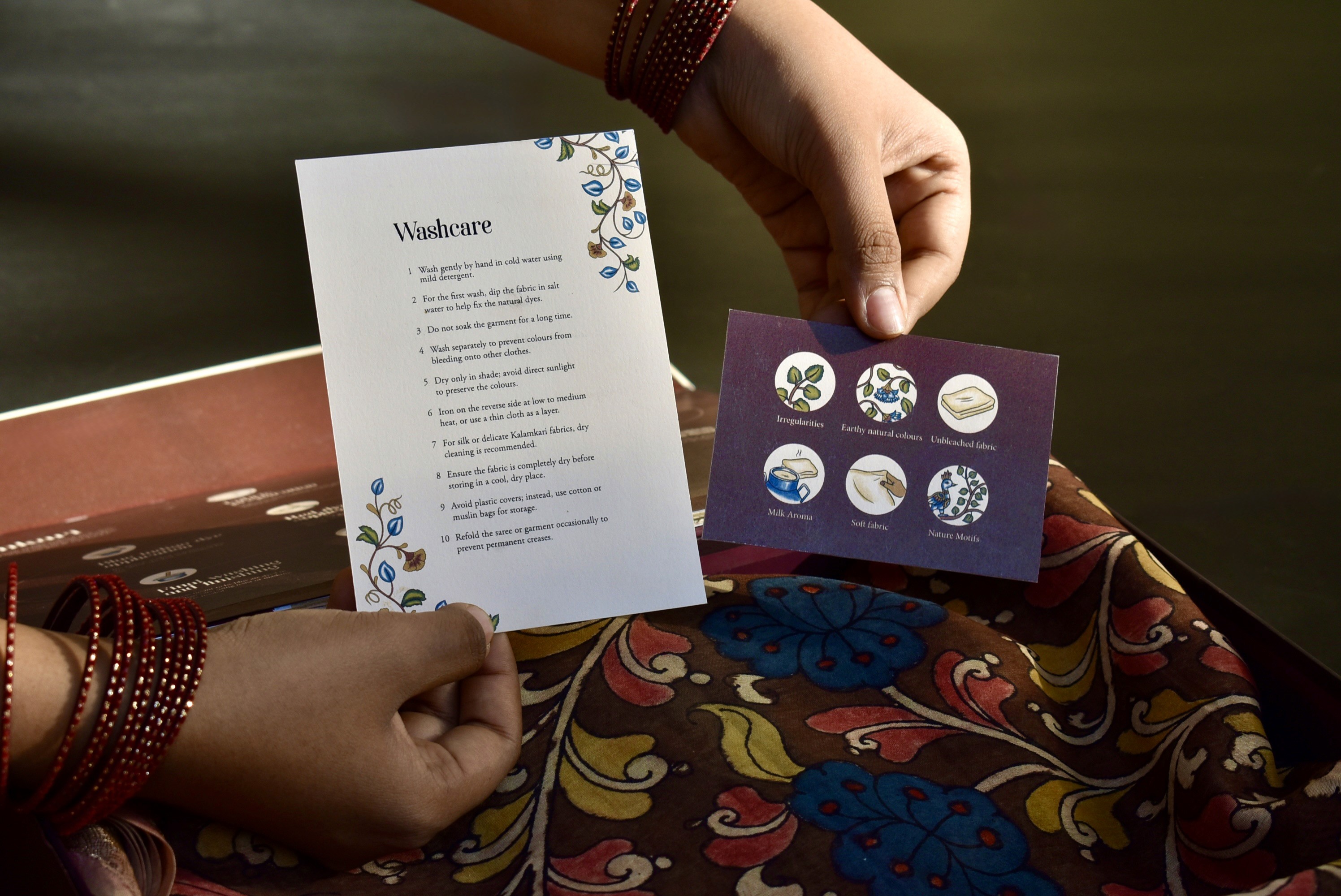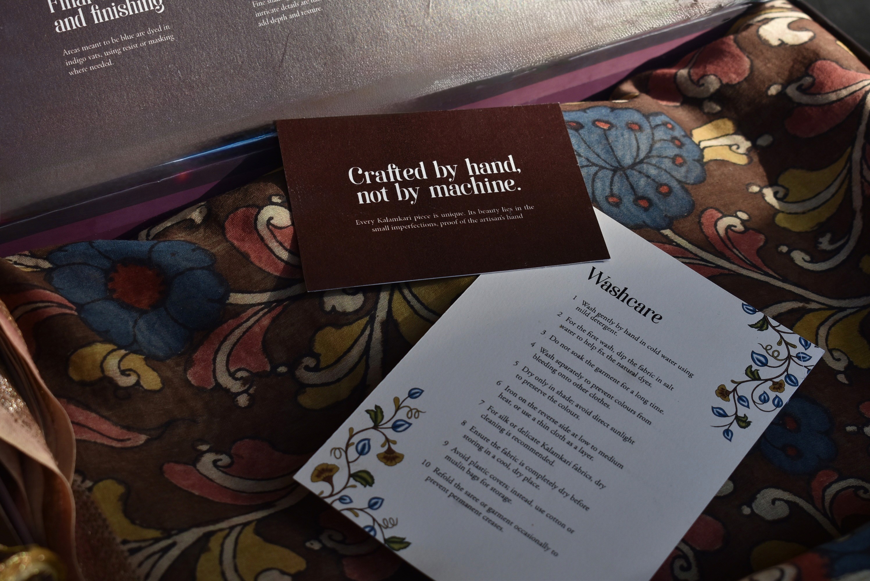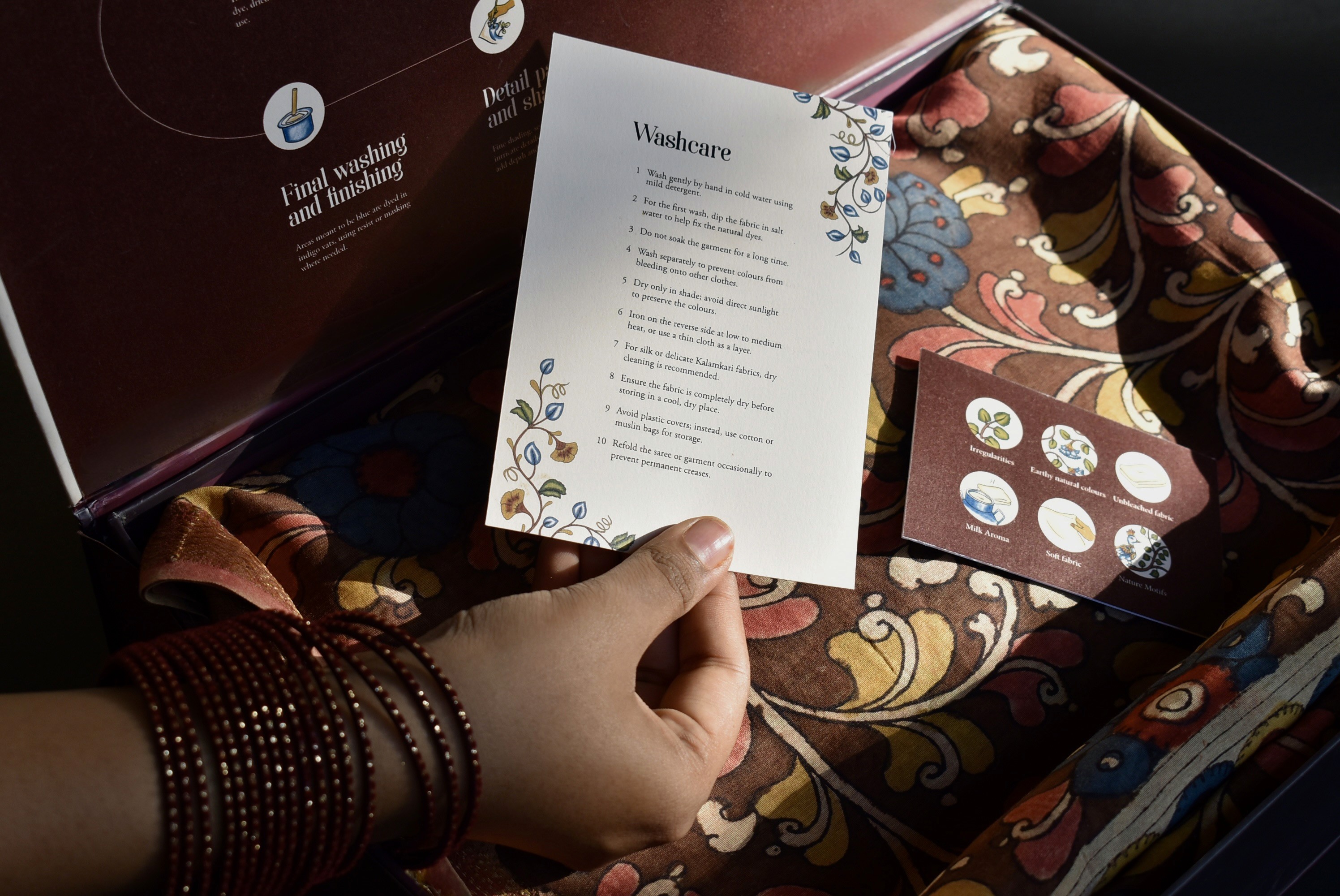 A detailed process card placed inside the box shows each stage of Kalamkari, from preparing the cloth to painting with natural dyes. This visual storytelling helps buyers understand the craft’s time, care, and authenticity.