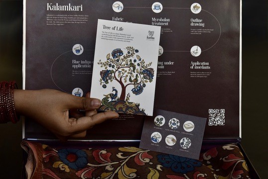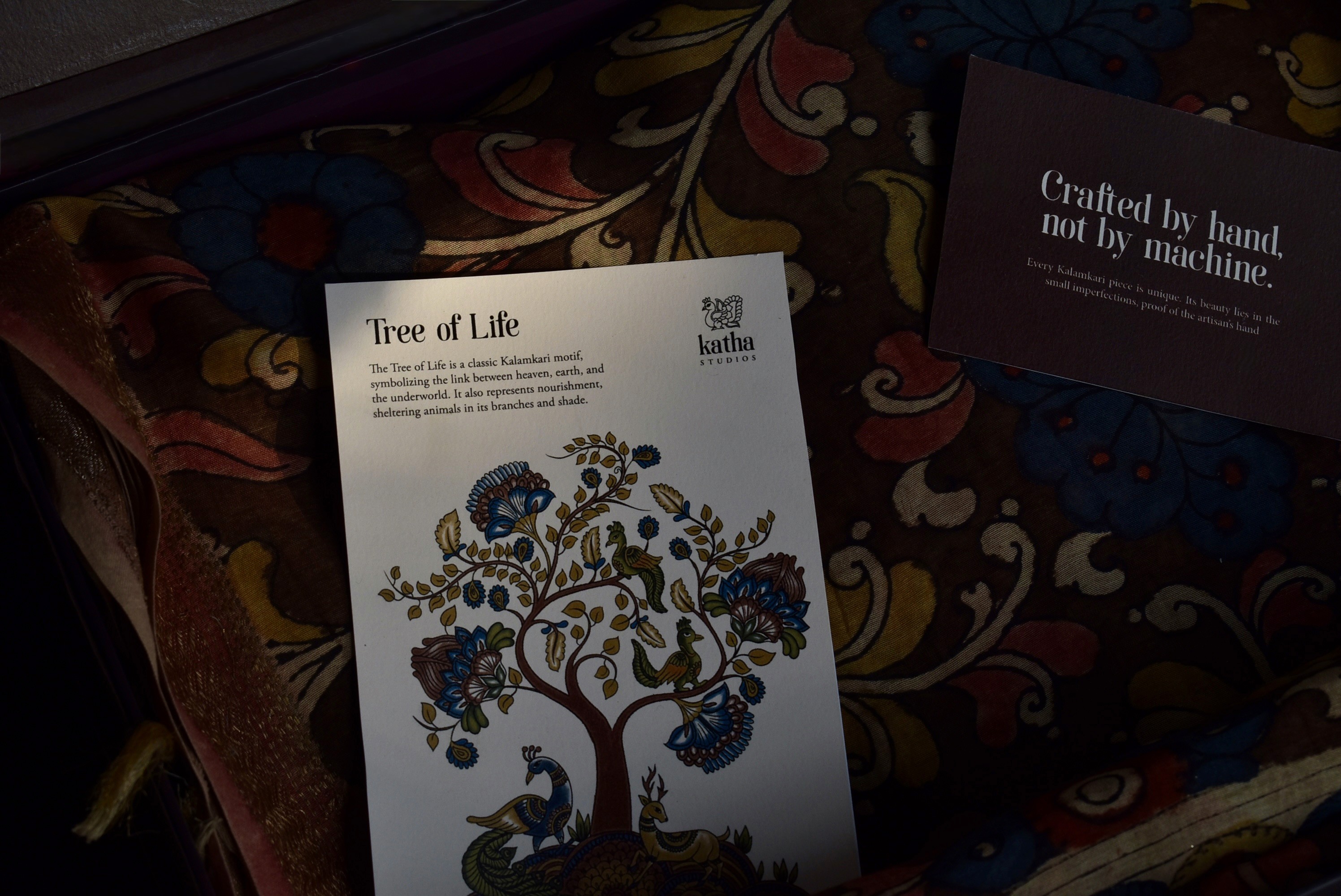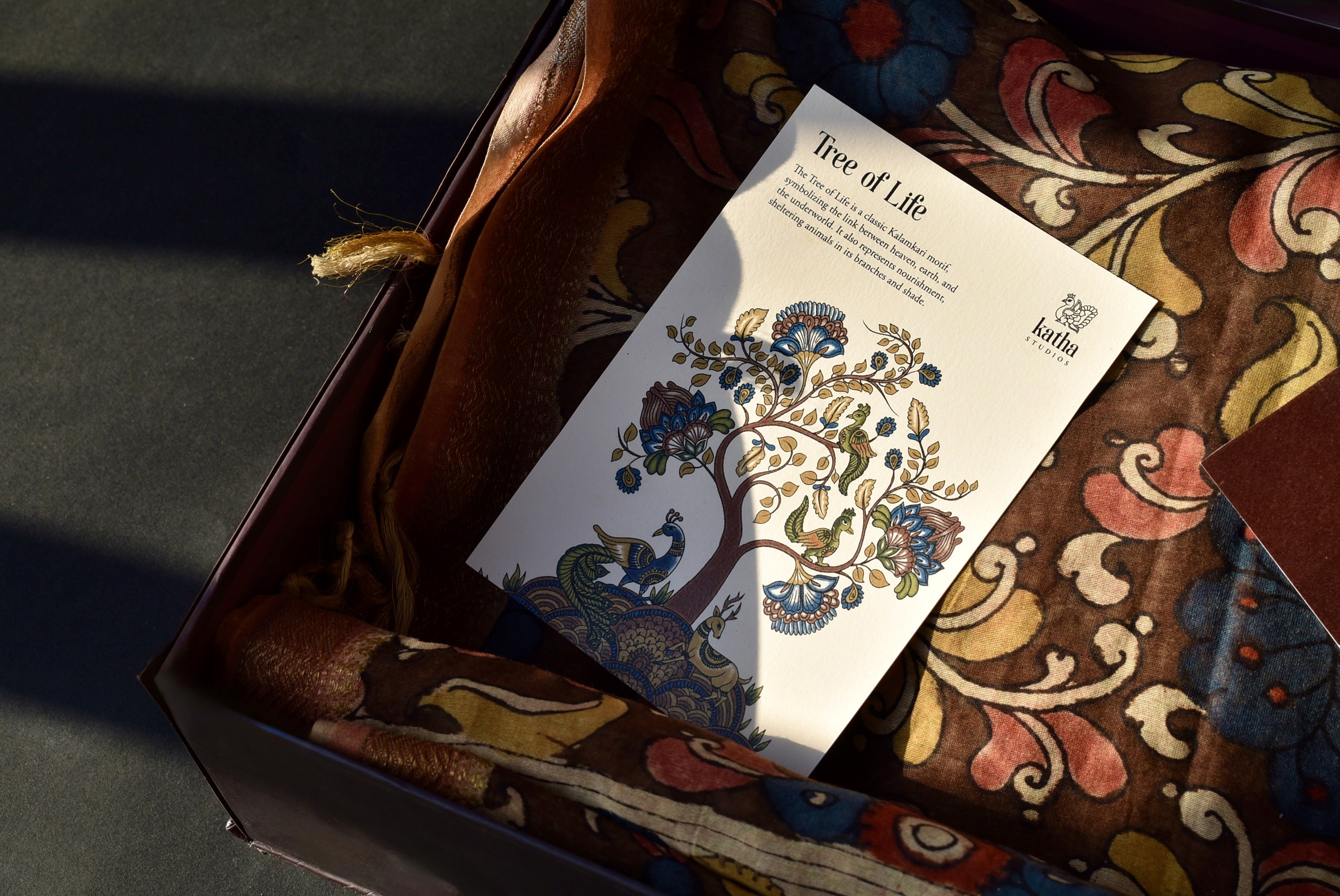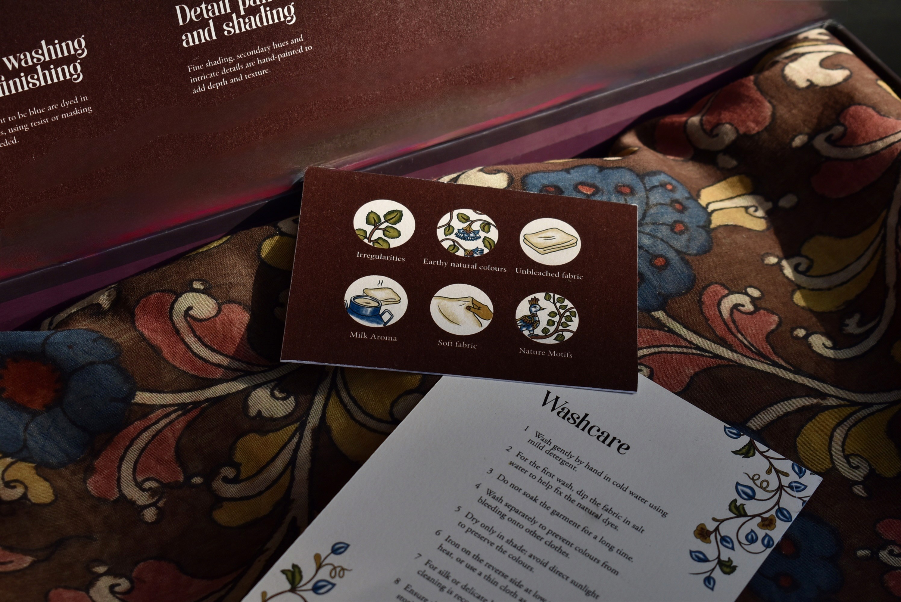 A detailed process card placed inside the box shows each stage of Kalamkari, from preparing the cloth to painting with natural dyes. This visual storytelling helps buyers understand the craft’s time, care, and authenticity.