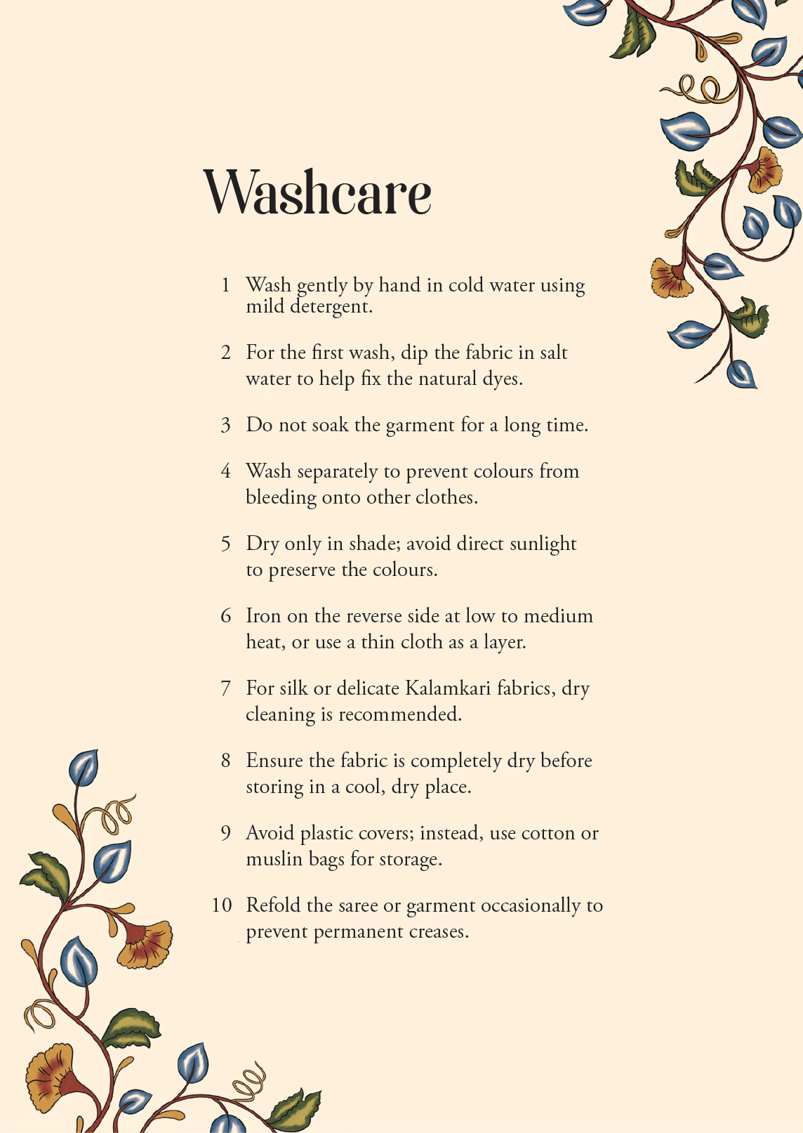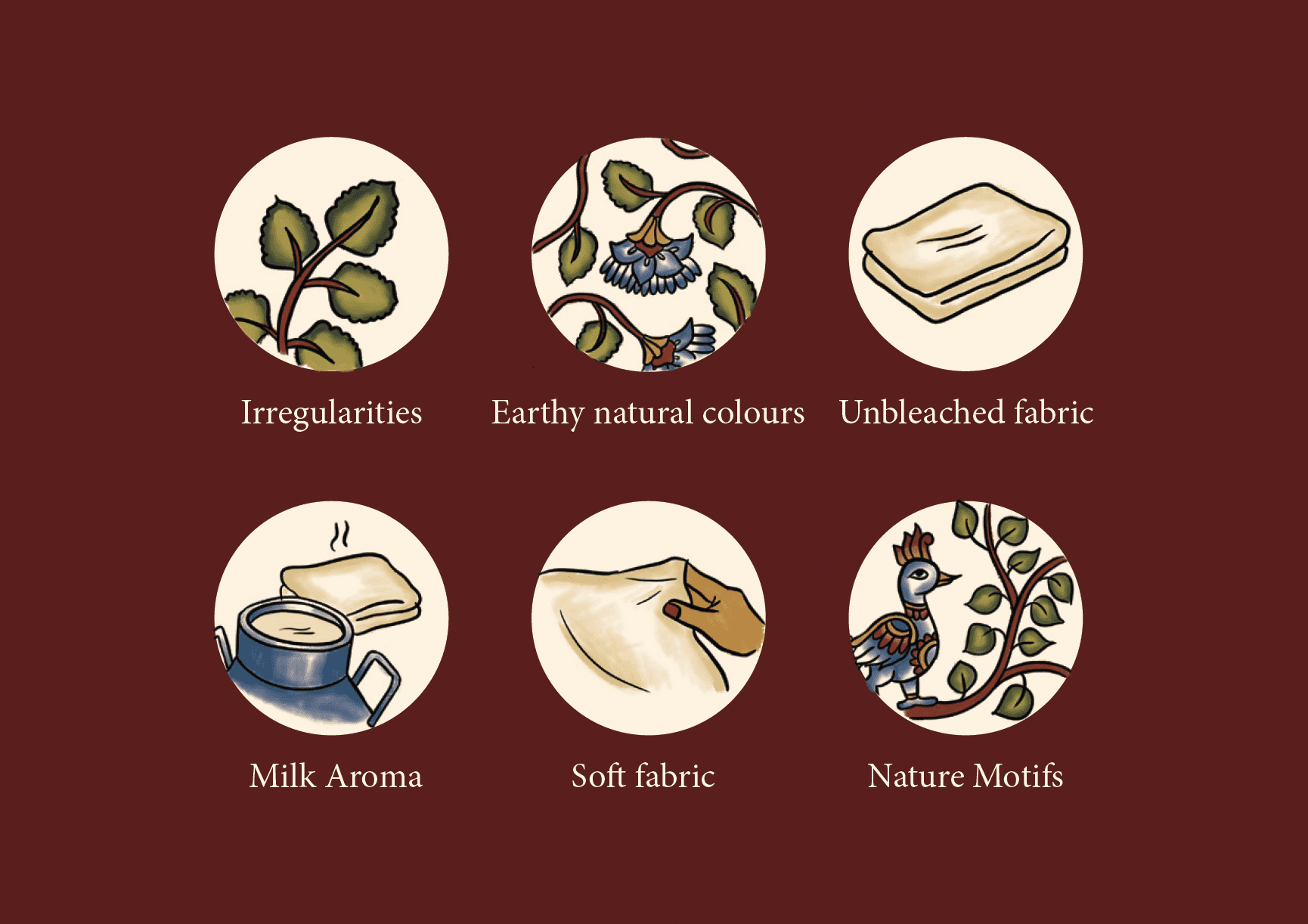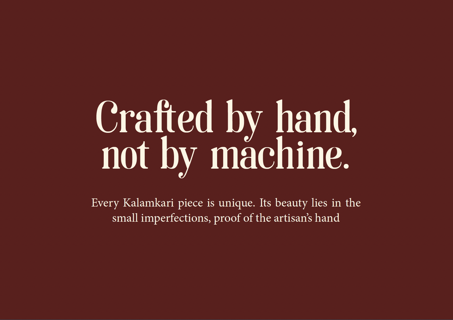 A small insert reading “Crafted by hand, not by machine” highlights traits of genuine Kalamkari, freehand outlines, color seepage, and irregularities that make each piece unique. It builds awareness and trust through subtle cues.