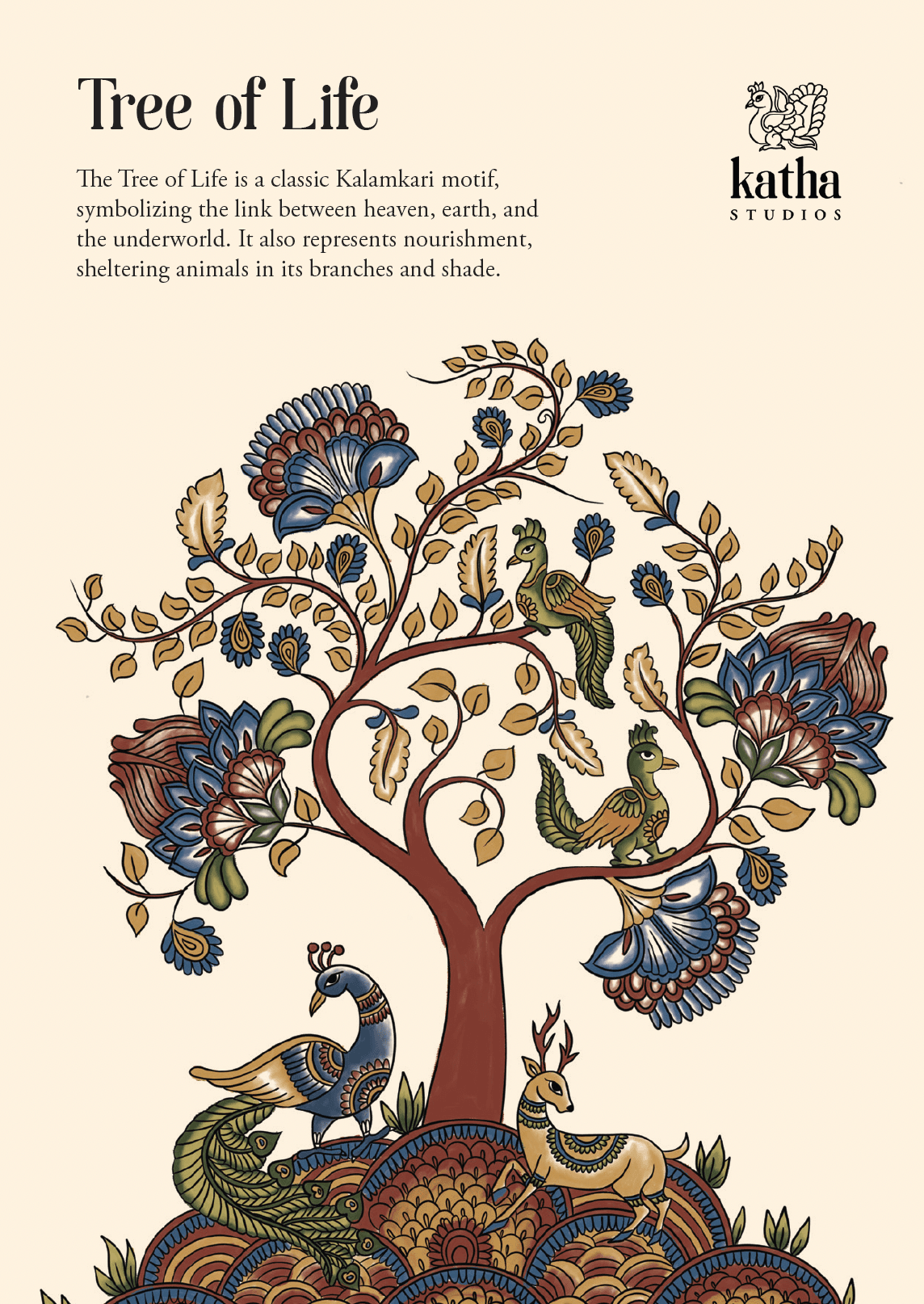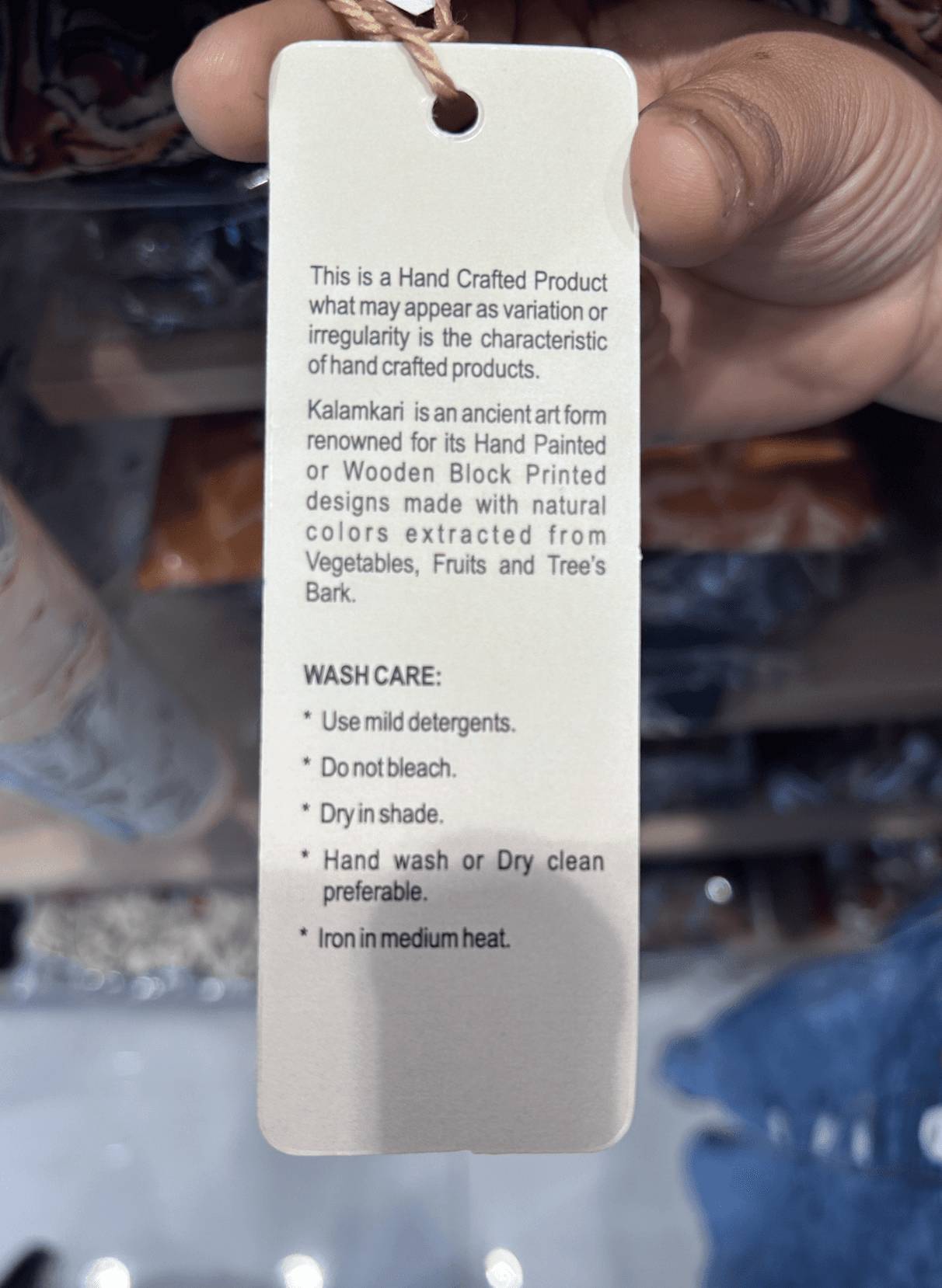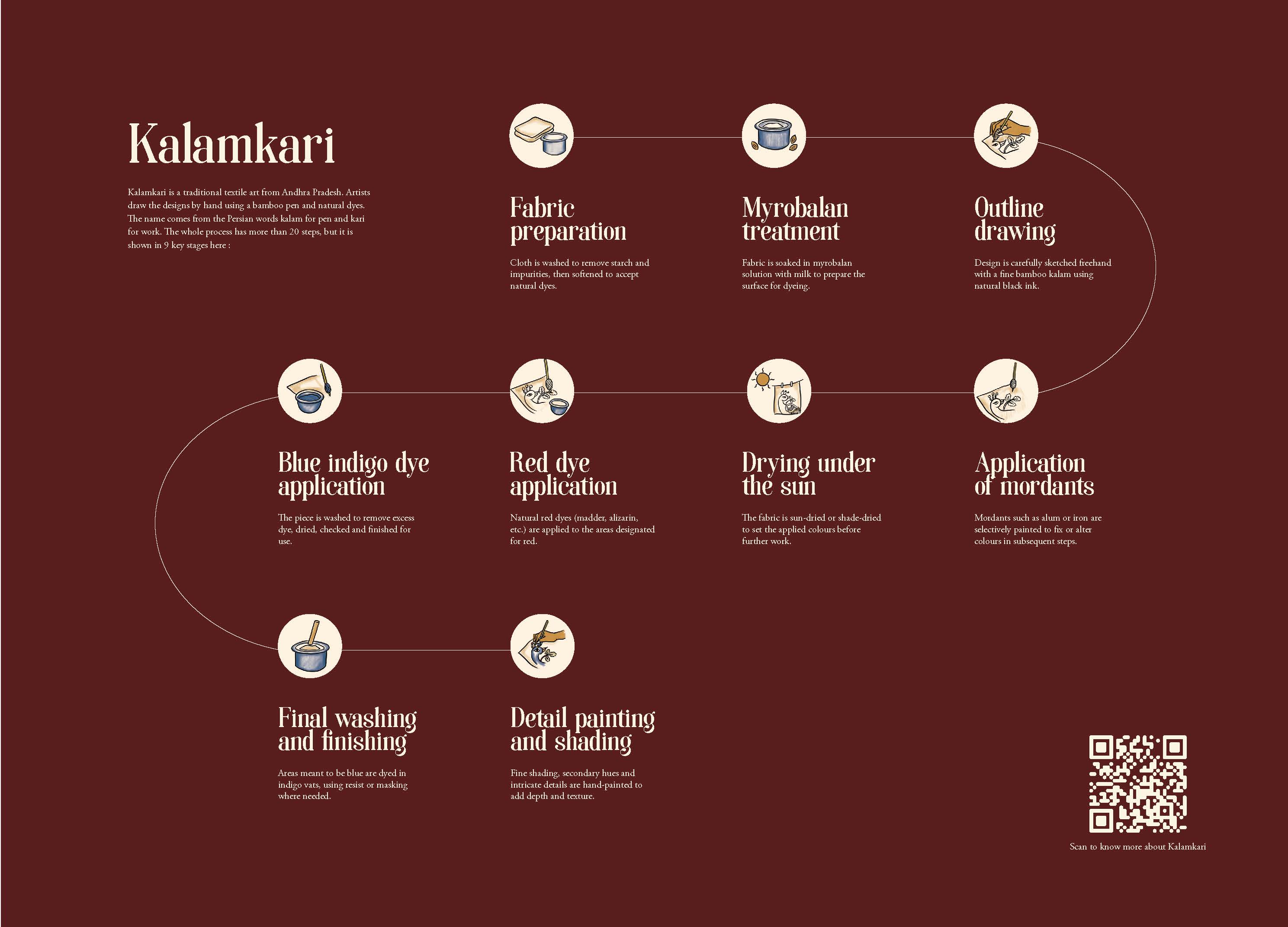 A small insert reading “Crafted by hand, not by machine” highlights traits of genuine Kalamkari, freehand outlines, color seepage, and irregularities that make each piece unique. It builds awareness and trust through subtle cues.