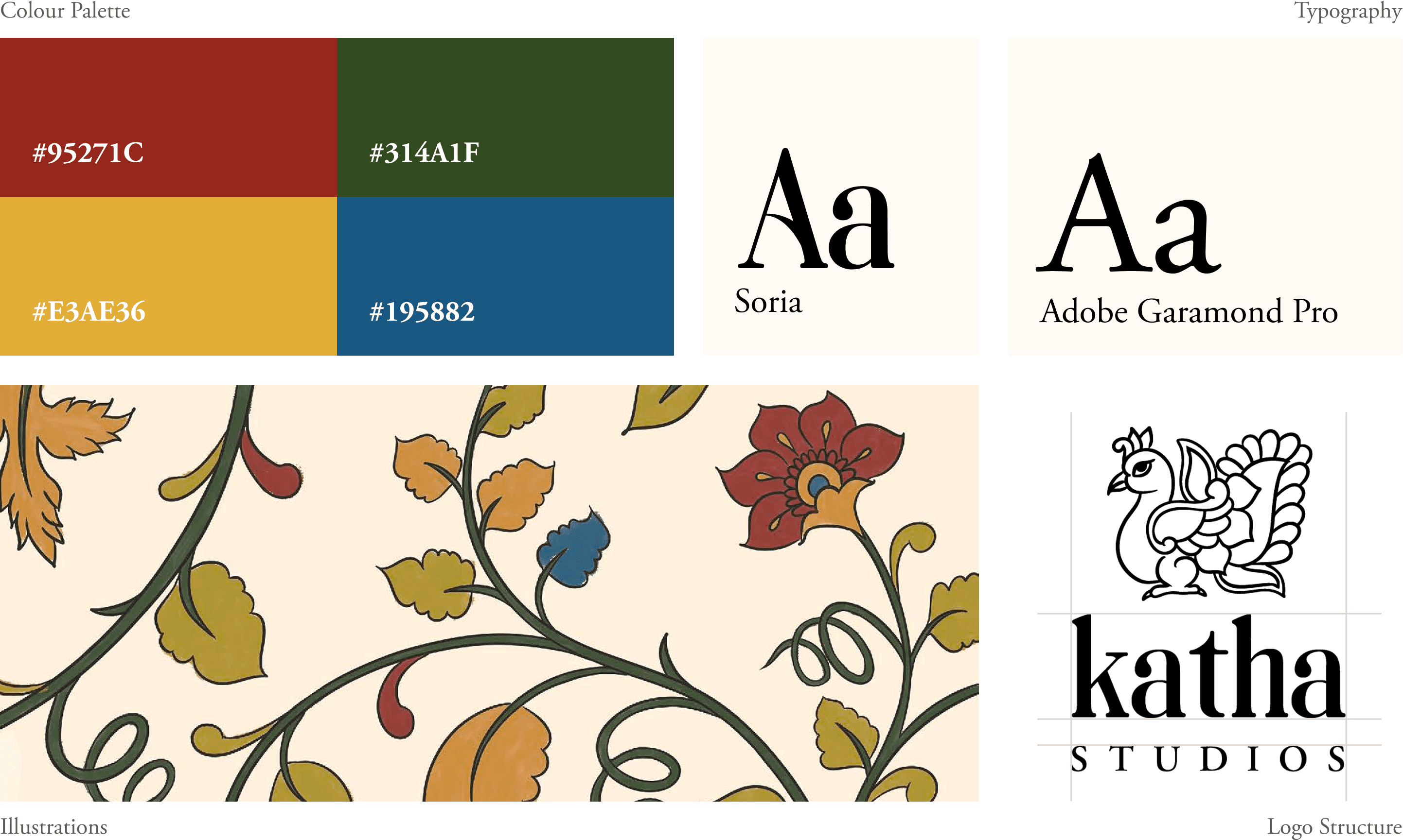 For the visual identity, I chose serif typefaces to convey a traditional feel, and the muted colour palette draws directly from the natural dyes used in authentic Kalamkari.