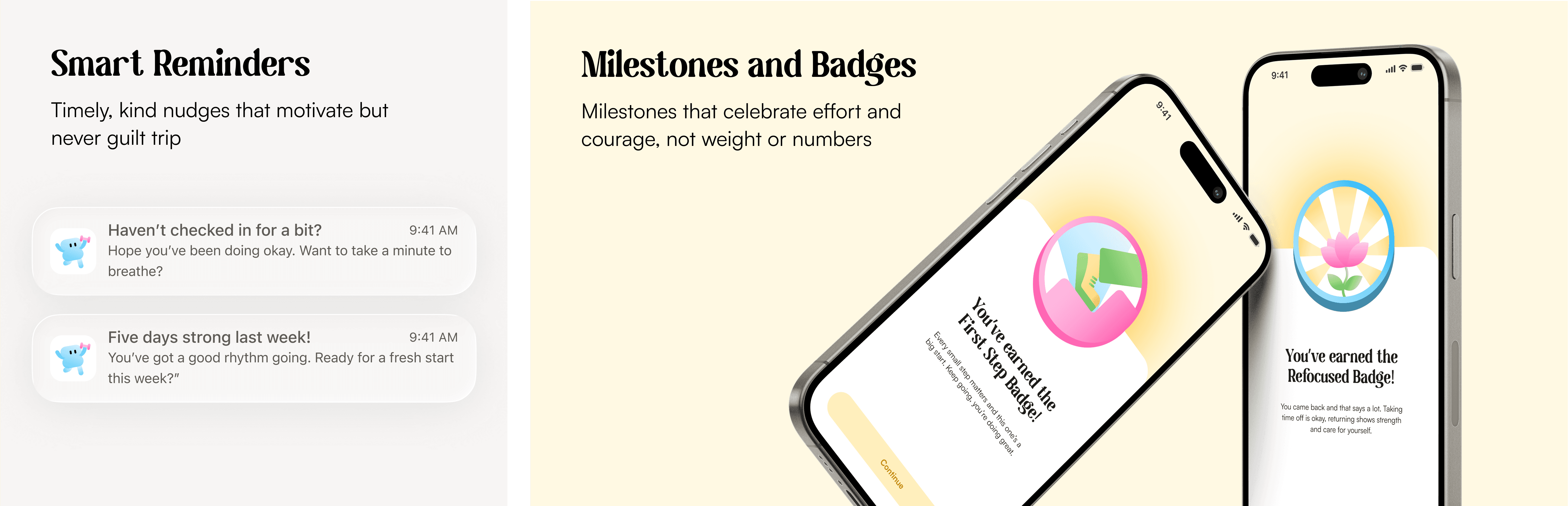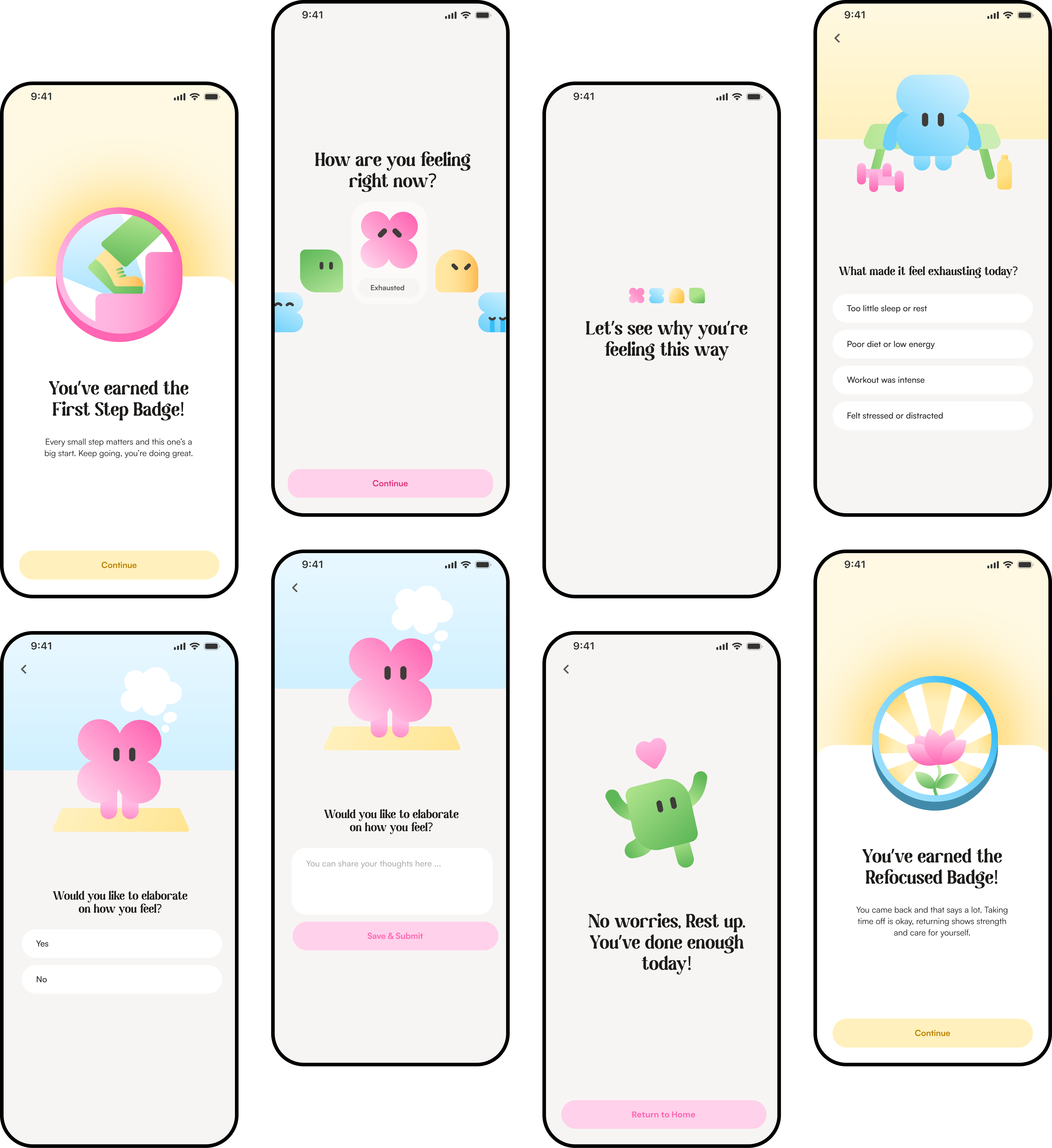 After each session, users earn badges for effort and consistency, not numbers. They’re also asked to reflect on their mood, which helps Noa understand their emotional progress and adjust plans accordingly.