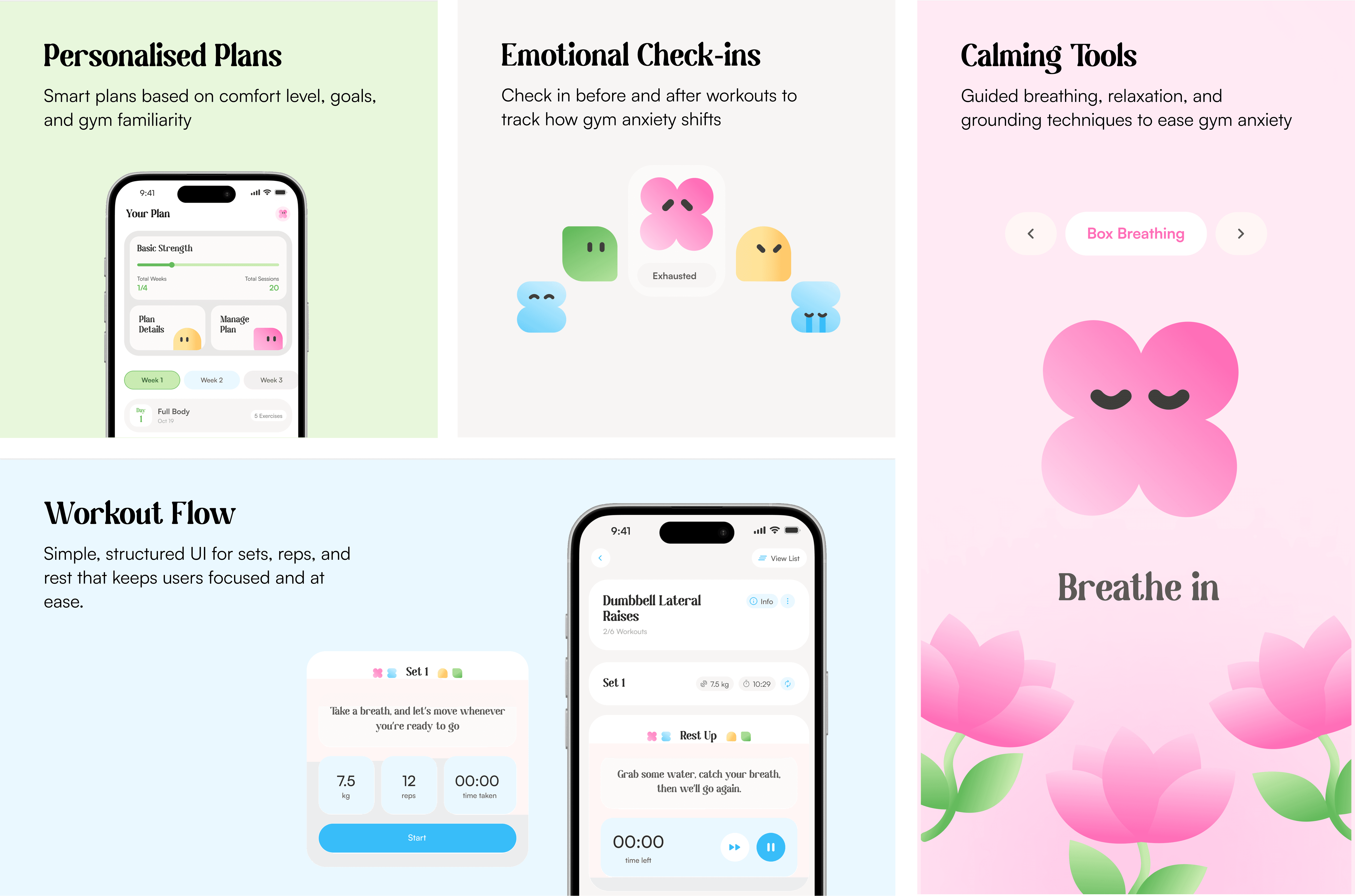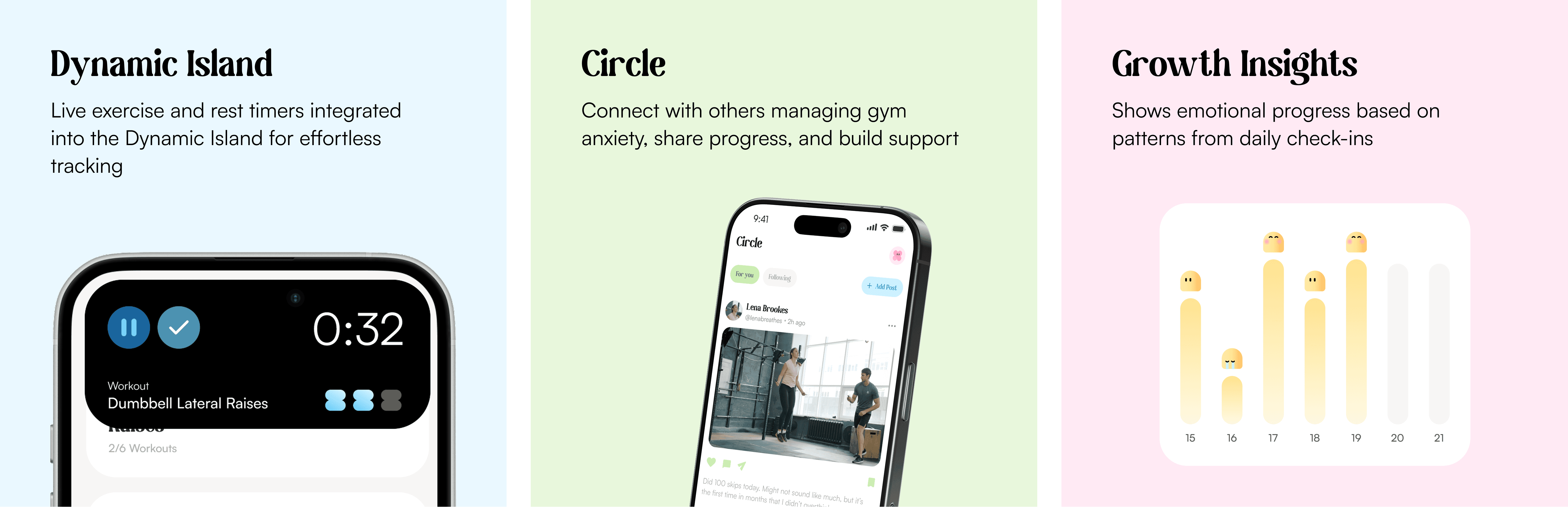 Many young adults struggle with gym anxiety due to unfamiliar machines, fear of judgment, and confusion about where to begin. Most fitness apps amplify this pressure by focusing on performance rather than reassurance.