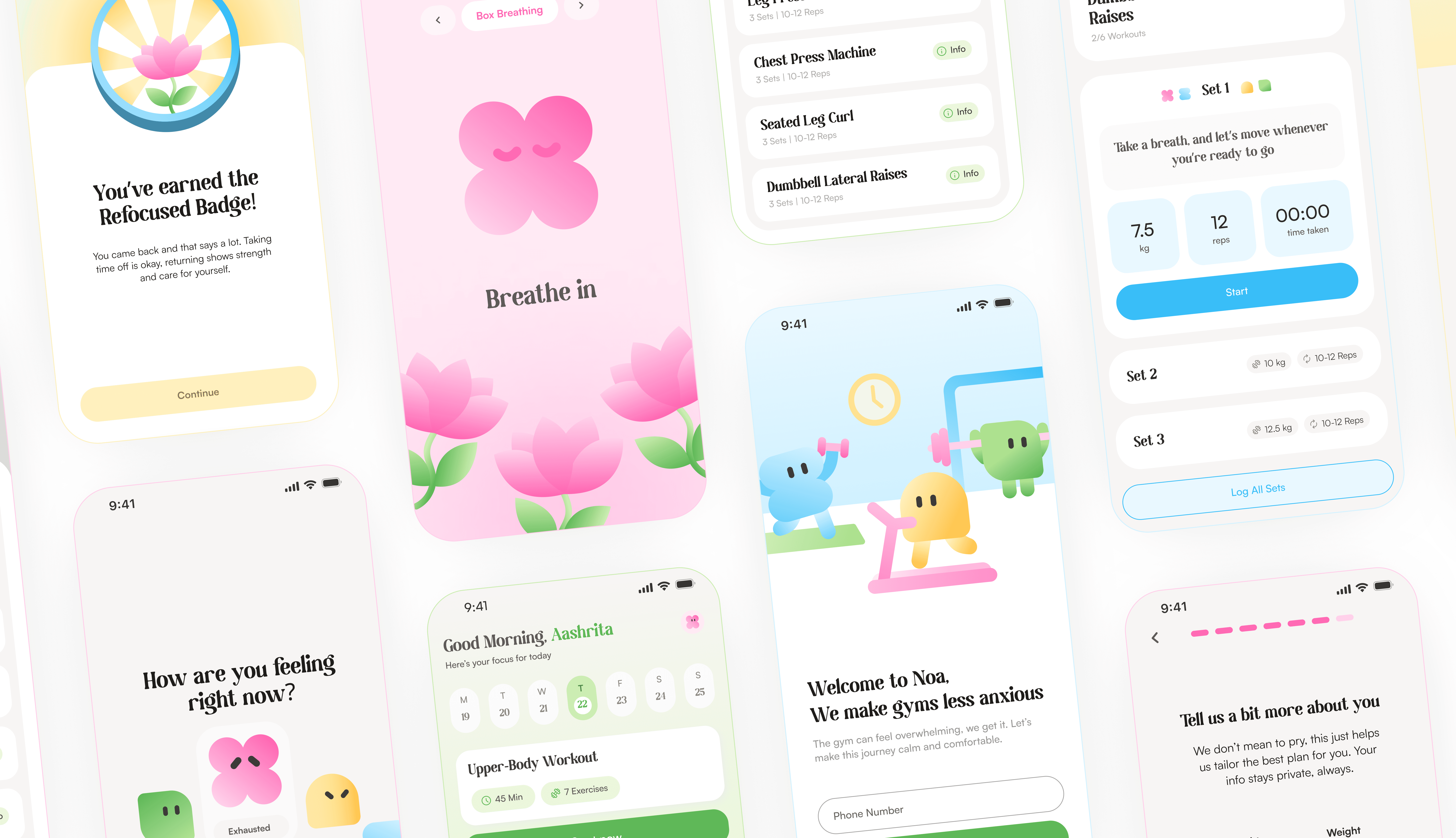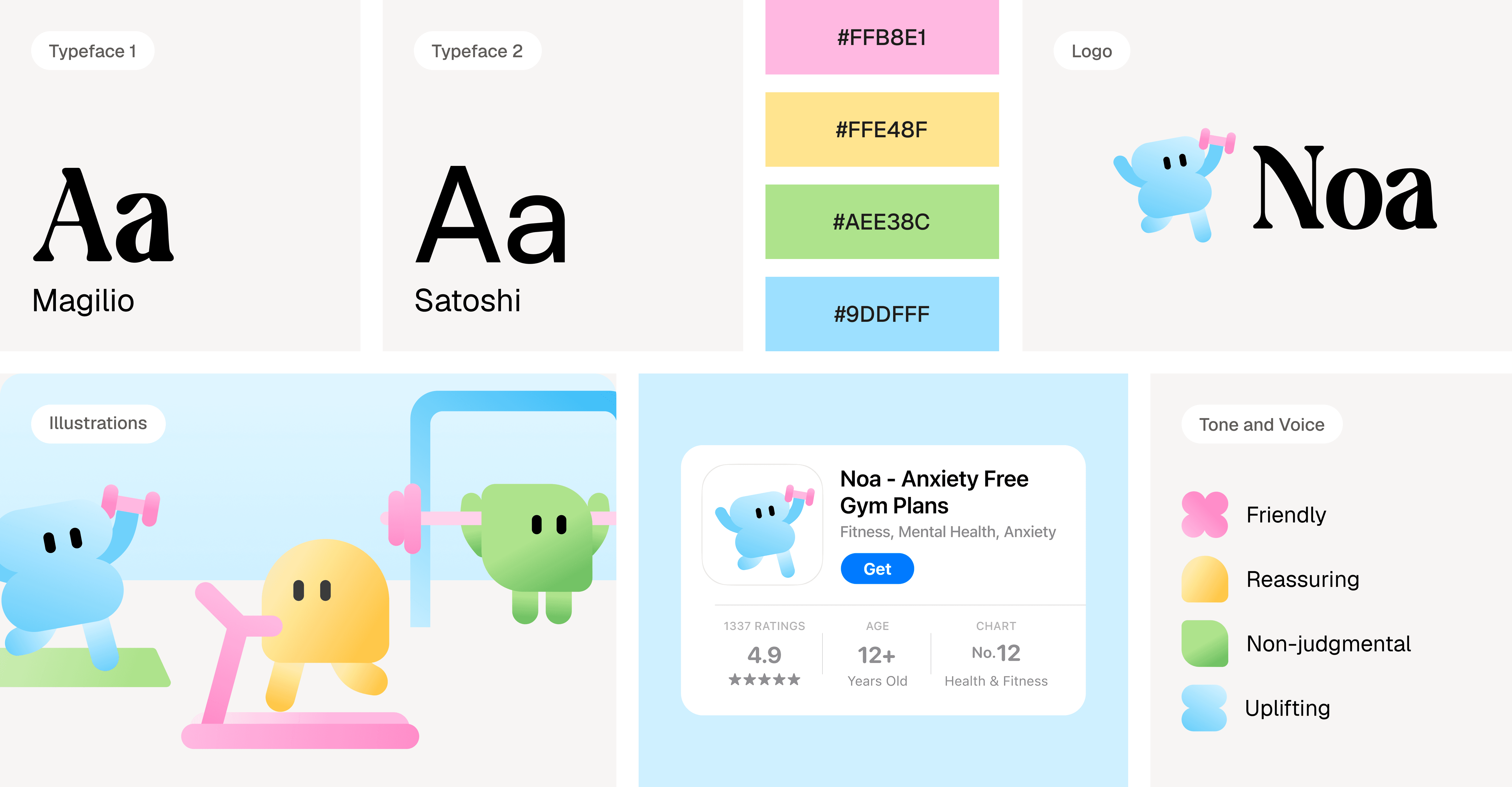 Noa’s design centres on comfort and reassurance, using soft pastels, approachable typefaces, and friendly illustrations to create a calm, non-intimidating gym experience. It intentionally avoids the intense, performance-driven style of typical fitness apps.
