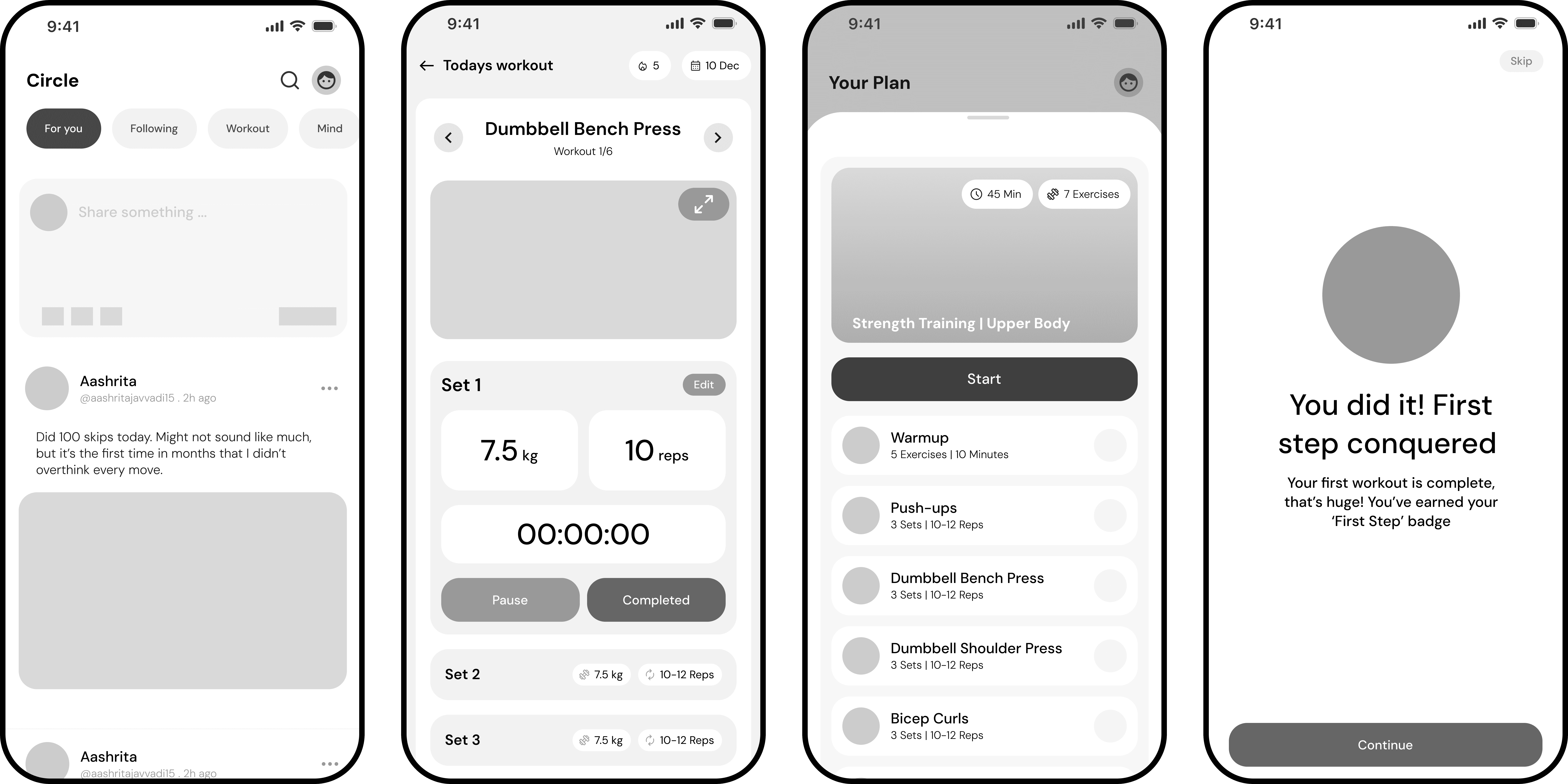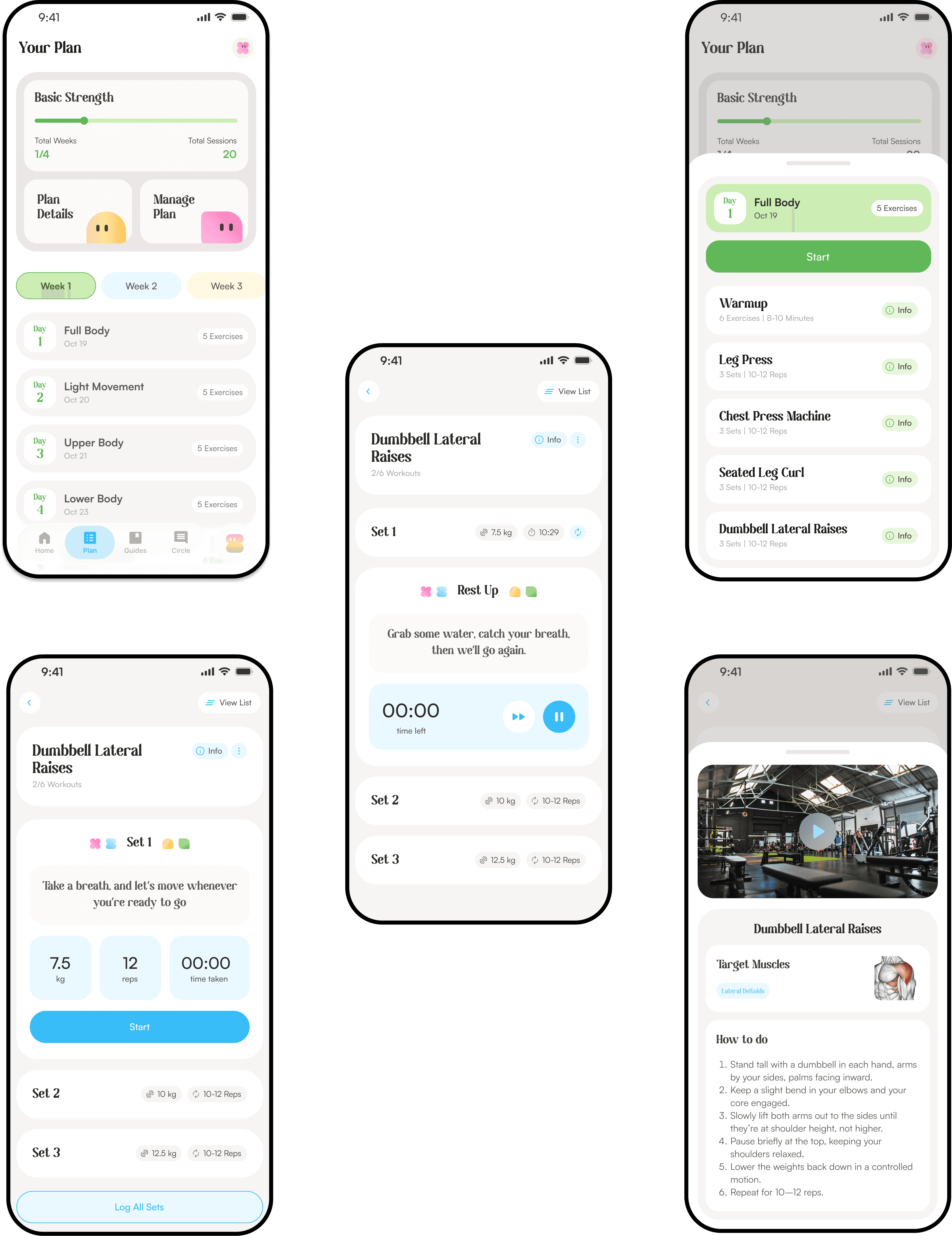 A motivating and straightforward workout flow that guides users through sets, reps, and rest while offering reminders and gentle encouragement. During breaks, it nudges users to hydrate and stay mindful.