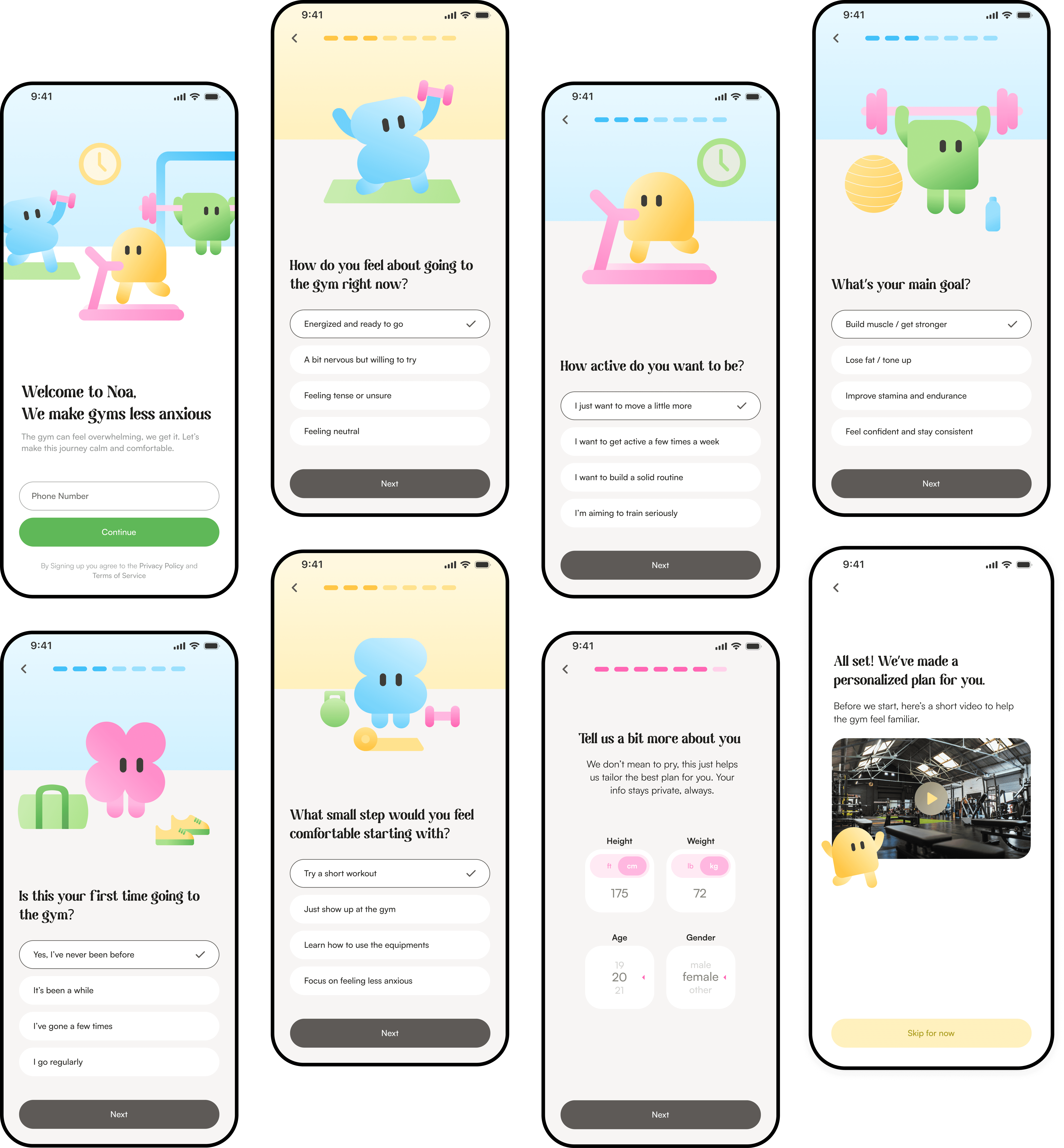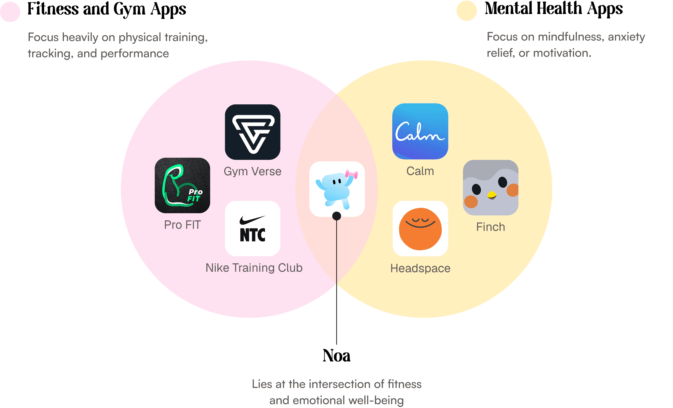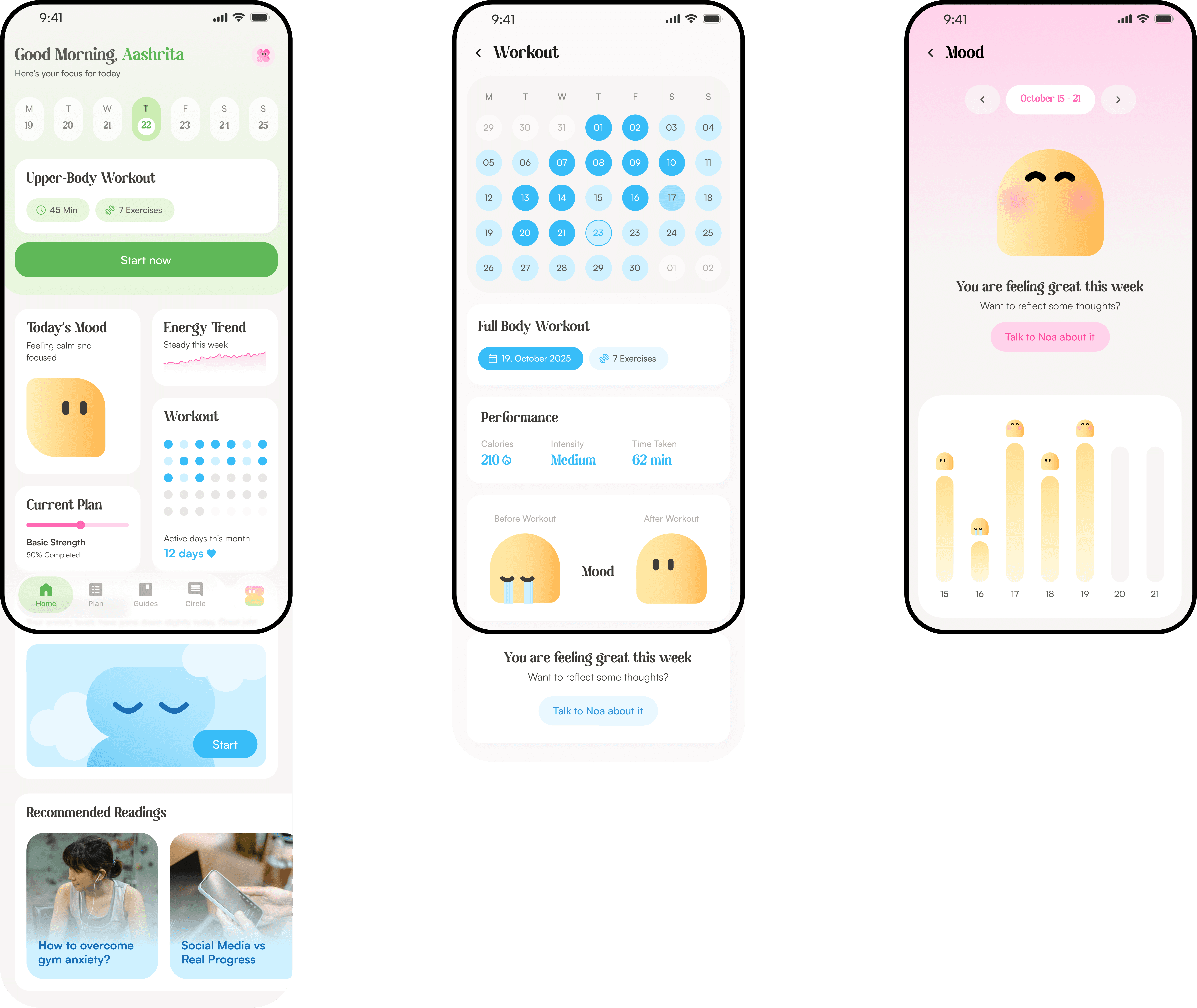 Based on these insights, Noa focuses on young adults aged 18–28 who are new to fitness or returning after a break. This group often feels anxious, self-conscious, or uncertain in gym environments and needs gentle guidance and reassurance to build comfort and consistency.