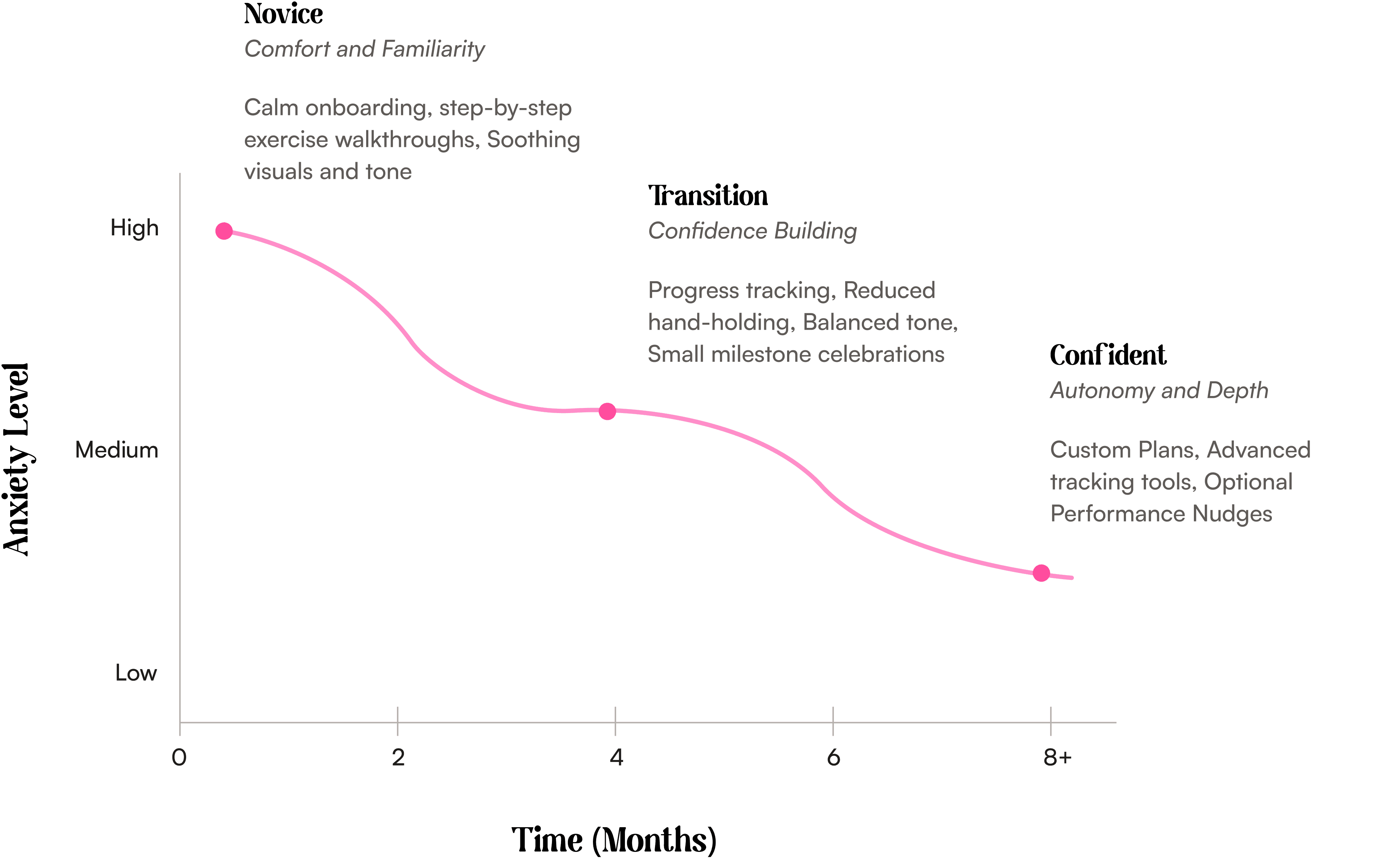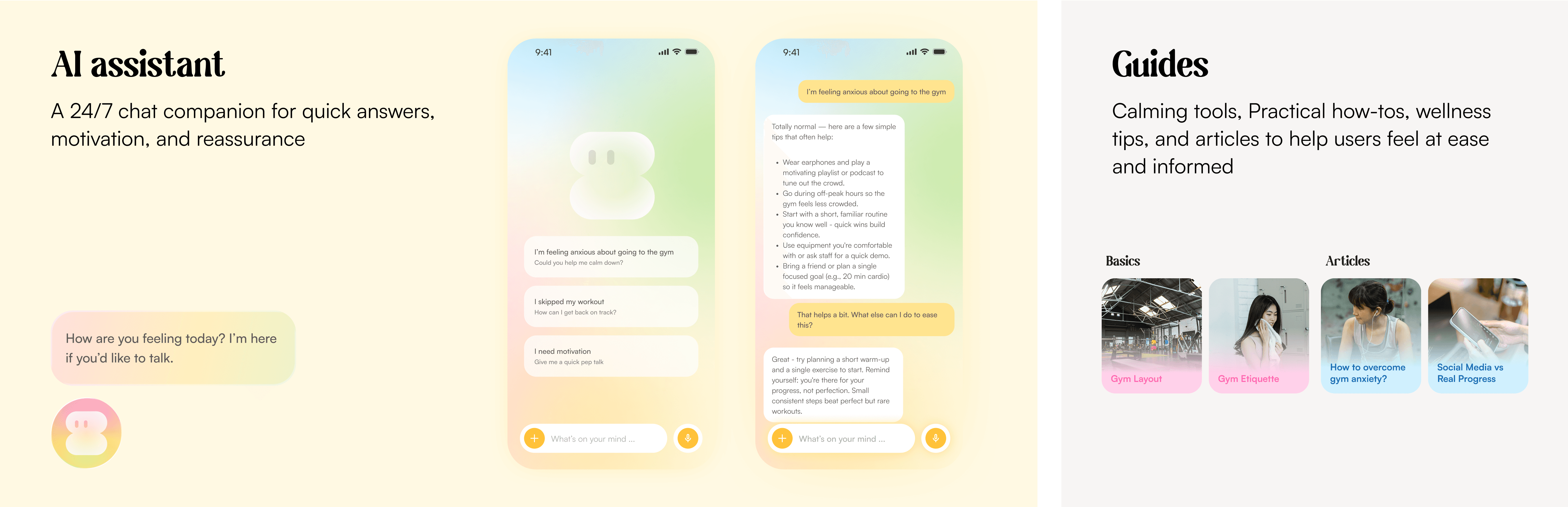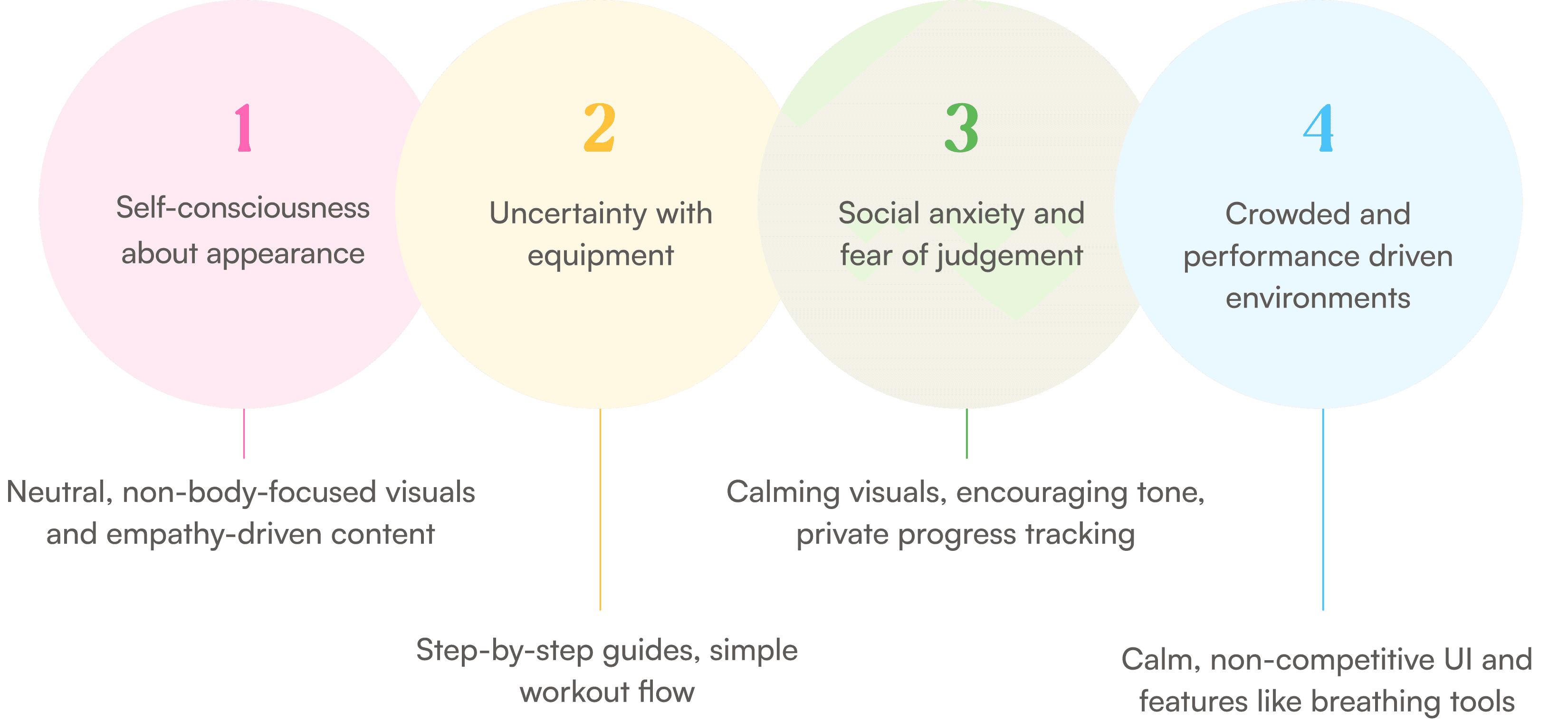 Based on these insights, Noa focuses on young adults aged 18–28 who are new to fitness or returning after a break. This group often feels anxious, self-conscious, or uncertain in gym environments and needs gentle guidance and reassurance to build comfort and consistency.